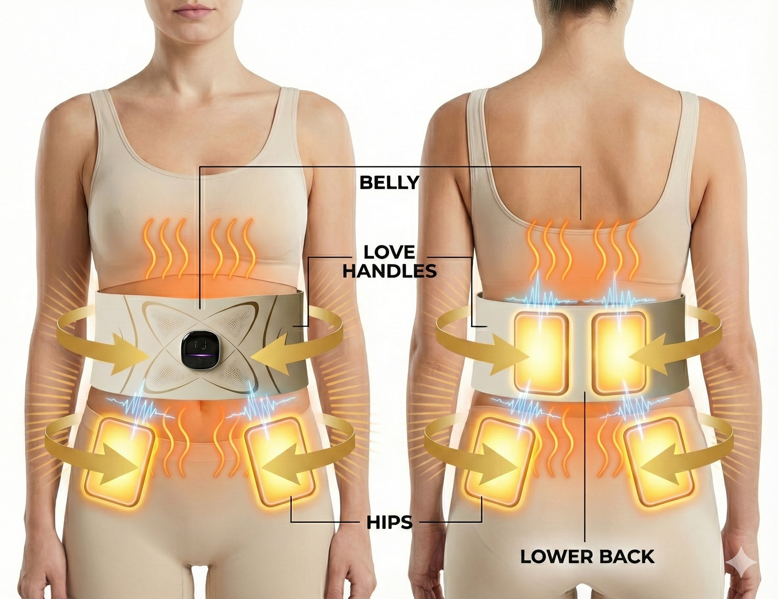 Here's the problem with regular vibration plates, handheld massagers, and even basic heating belts: they only work on ONE area at a time. You'd have to manually hold or position them for 15 minutes on your belly, then 15 on your left hip, then 15 on your right hip, then 15 on your back...